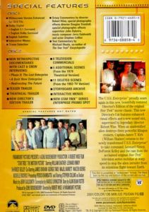 Disc 1: Interactive Menus Scene Selection Group Commentary by Director Robert Wise, Special Photographic Effects Director Douglas Trumbull, Special Photographic Effects Supervisor John Dykstra, Music Composer Jerry Goldsmith and Actor Stephen Collins Text Commentary by Michael Okuda, Co-Author of The Star-Trek® Encyclopedia