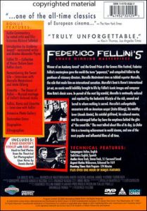 Audio Commentary by Noted Critic and Film Historian Richard Schickel Introduction by Academy Award Nominated Writer and Director Alexander Payne Fellini TV: Collection of Never Before Seen Fellini Shorts Remembering the Sweet Life: Interviews with Marcello Mastroianni and Anita Ekberg Cinecitta: The House Of Fellini - Musical Montage of Fellini's Beloved Studio Fellini, Roma and Cinecitta: Interview With Fellini Extensive Photo Gallery Restoration Demo Biographies Filmographies 8 Page Collector's Booklet with Rare and Hard To Find Photos from the Theatrical Set Photographer! Liner Notes by Dennis Bartok